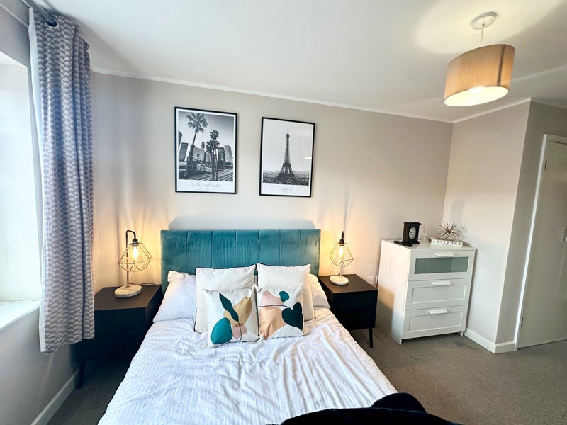 With a built-in wardrob and a free standing wardrobe, double size bed with comfortable mattress, chest of drawers and 2 large bedside tables with drawers and lamps included!