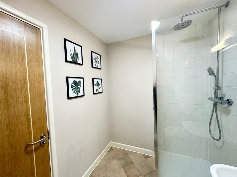 As you enter the flat, you will have your Bathroom opposite, this has a huge Rainfall shower cubical, as well as toilet and sink, there is also a light up mirror built in above the sink.