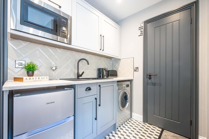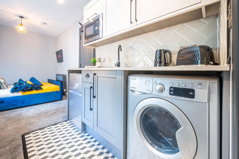 The studio has its own washer dryer and access to the communal kitchen (only used by one other room) for the oven and hob.