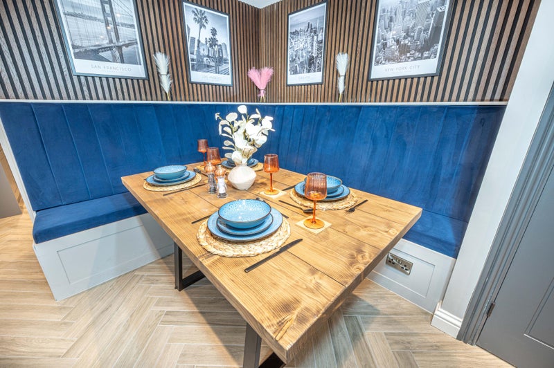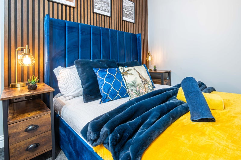 ⭐️ All Units come with our signature Double Midnight Navy upholstered bed with memory foam mattress ensuring you have the best night’s sleep