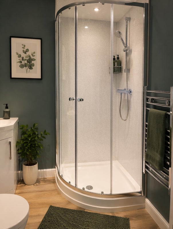 The bathroom is modern and immaculately presented, with a stylish enclosed shower, contemporary fittings, and a clean, fresh finish throughout—designed for both practicality and comfort.