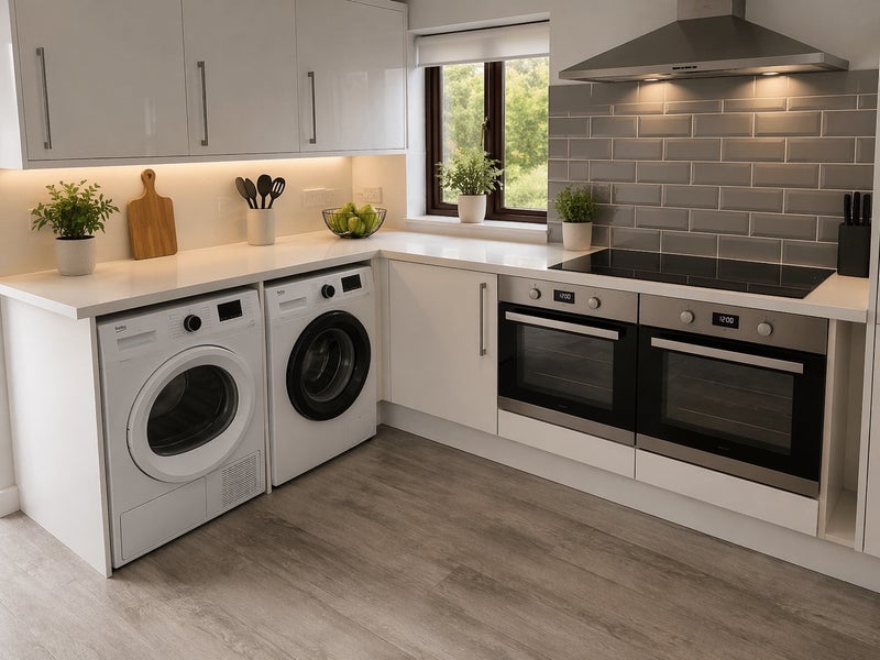 The kitchen is bright and contemporary, featuring sleek white units, modern worktops, and integrated appliances. The space has been thoughtfully arranged to provide a clean, uncluttered environment with ample storage and preparation space.