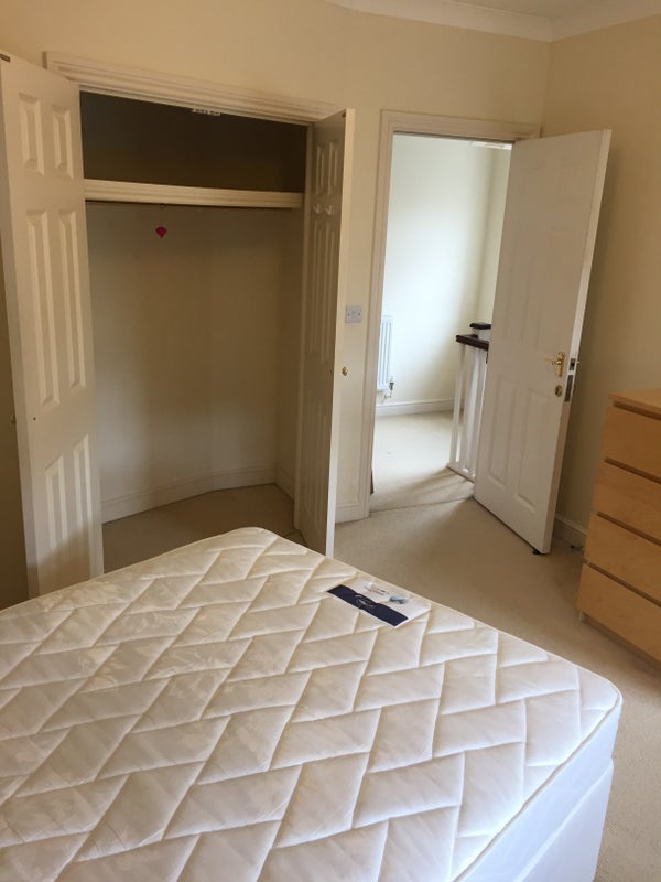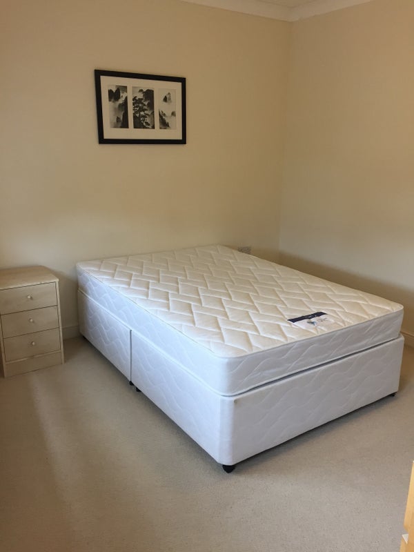 The room has a double bed and mattress, bedside table chest of drawers, a large built in wardrobe and a TV point.