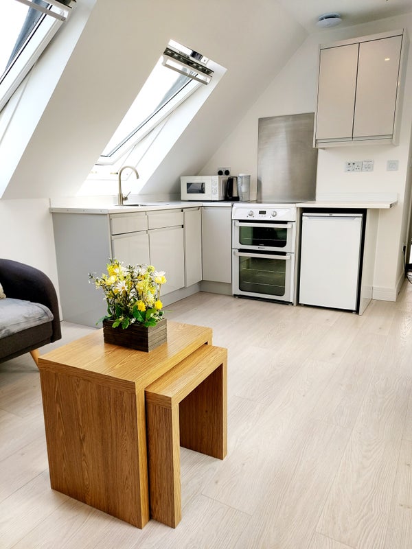 Studio layout, fully equipped kitchenette, shower & toilet, double bed space, underfloor heating, TV and Internet. Washing/drying facilities.