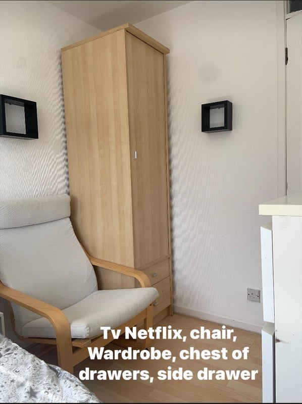 Double bed with ottoman storage, bedside table with lamp, single chair, wardrobe with 2 drawers, chest of drawers & TV with Netflix.