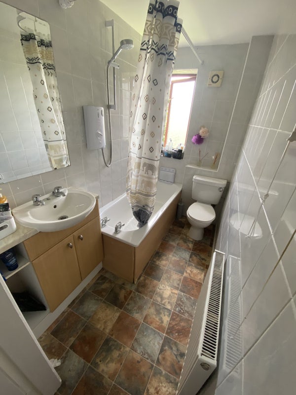 Upstairs: Fully tiled bathroom, incorporating, bath, shower, toilet and vanity unit.