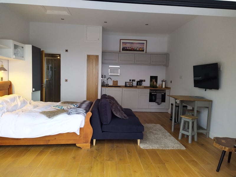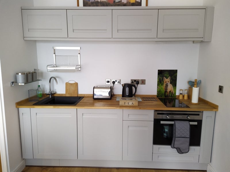 Our generous annexe suite includes a fully-equipped kitchenette (oven, induction hob, microwave and fridge-freezer), KING SIZE BED, en-suite (shower, WC and hand basin), sofa, 40 inch Smart TV with Freeview Player and Wi-Fi + Ethernet.